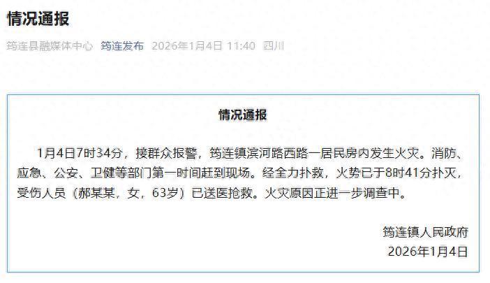1月4日7时34分,接群众报警,筠连镇滨河路西路一居民房内发生火灾。消防、应急、公安、卫健等部门第一时间赶到现场。经全力扑救,火势已于8时41分扑灭,受伤人员(郝某某,女,63岁)已送医抢救。火灾原因正进一步调查中。